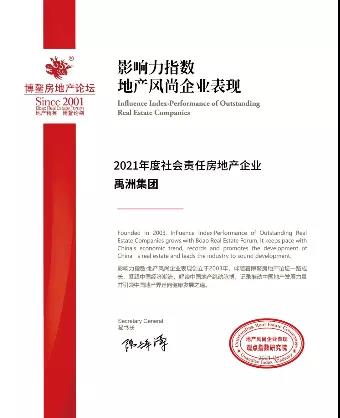 禹洲集團更于9月15日在“2021中國房地產(chǎn)品牌價值研究成果發(fā)布會暨第十八屆中國房地產(chǎn)品牌發(fā)展高峰論壇”上獲得 “2021中國物業(yè)服務標準化運營領(lǐng)先品牌企業(yè)”、 “2021值得資本市場關(guān)注的物業(yè)品牌”兩項大獎;于9月16日在“2021博鰲房地產(chǎn)論壇”中榮獲“2021年度影響力地產(chǎn)企業(yè)(30強)”、“2021年度社會責任房地產(chǎn)企業(yè)”,再次力證集團領(lǐng)先的綜合實力和競爭力。