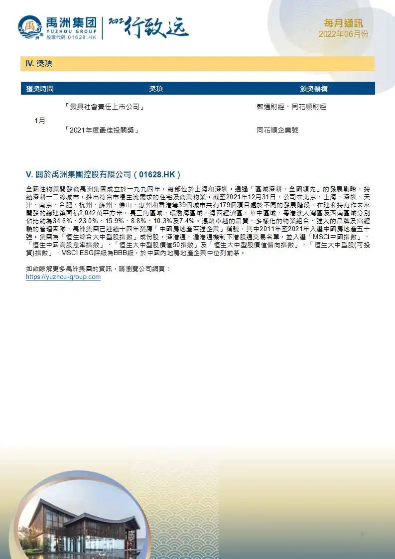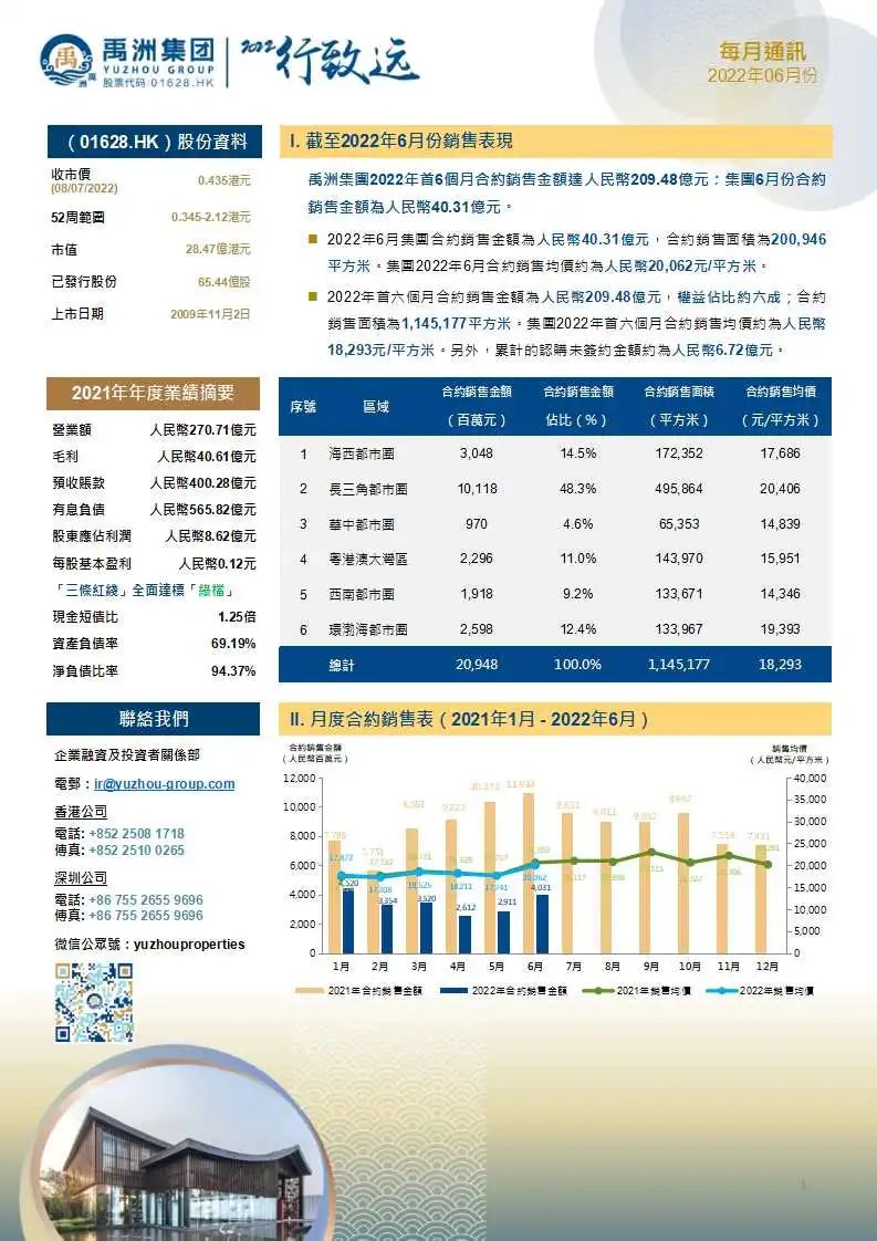2022年6月,禹洲集團(tuán)實現(xiàn)合約銷售金額為人民幣40.31億元,合約銷售面積為200,946平方米,合約銷售均價約為人民幣20,062元/平方米。