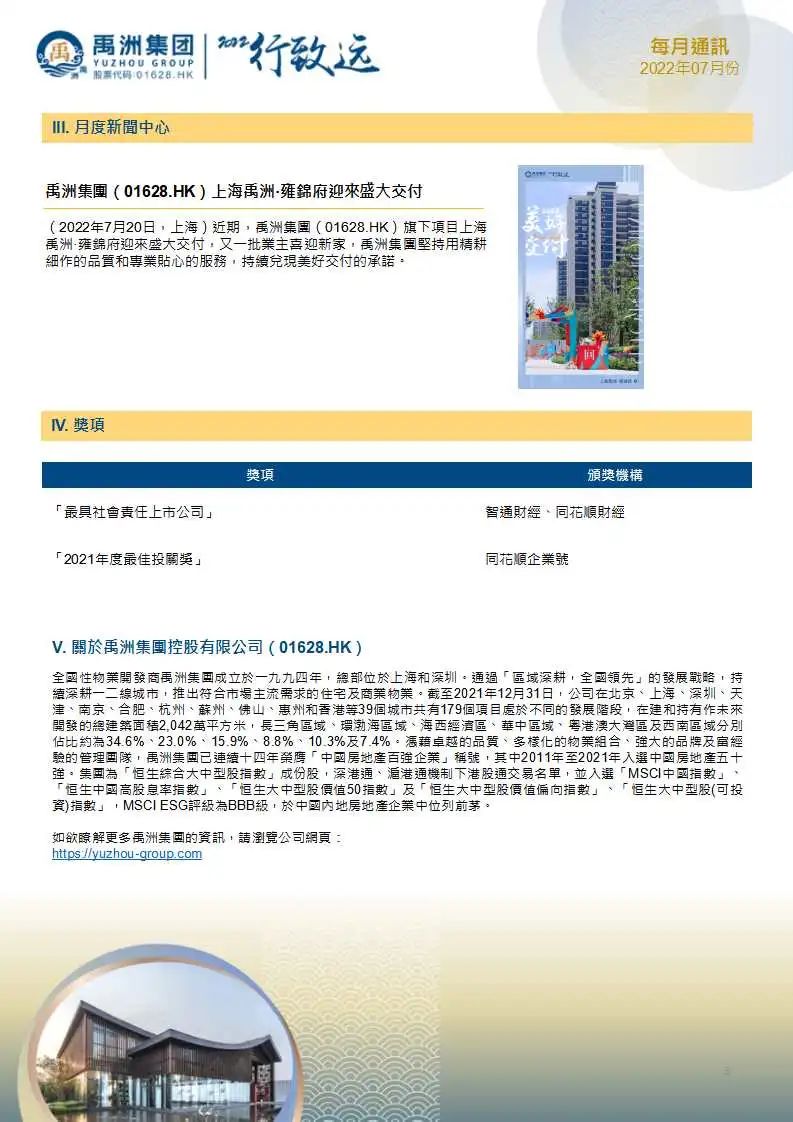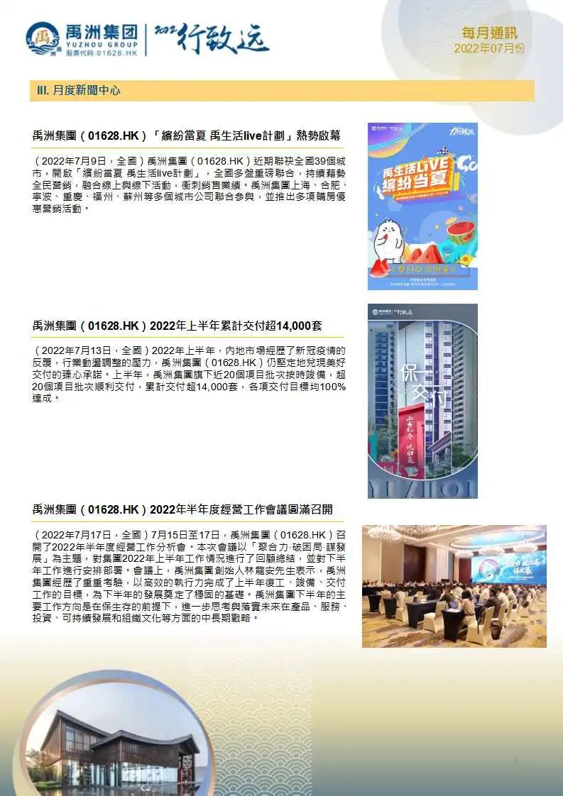 2022年前7個月,禹洲集團實現(xiàn)累計銷售金額為人民幣239.00億元,累計銷售面積為1,346,626平方米,平均銷售價格為人民幣17,748元/平方米。另外,截至2022年7月31日,集團累計的認(rèn)購未簽約金額為人民幣4.45億元。