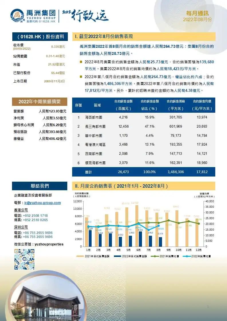 2022年8月,禹洲集團(tuán)實(shí)現(xiàn)合約銷售金額為人民幣25.73億元,合約銷售面積為139,680平方米,合約銷售均價(jià)約為人民幣18,423元/平方米。