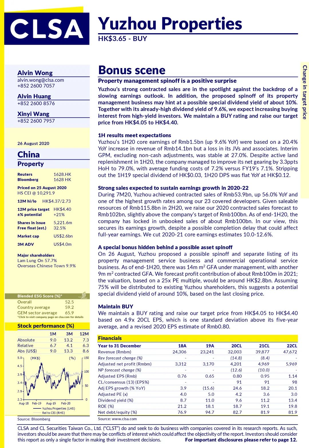 國(guó)際知名投行中信里昂近日發(fā)布研究報(bào)告指出,禹洲集團(tuán)(01628.HK)2020年上半年業(yè)績(jī)符合預(yù)期,持續(xù)強(qiáng)勁的銷售表現(xiàn)對(duì)未來盈利增長(zhǎng)帶來良好預(yù)期,加上物管業(yè)務(wù)分拆將帶來巨大效益,將禹洲集團(tuán)目標(biāo)價(jià)上調(diào)至4.4港元,維持“買入”評(píng)級(jí)。