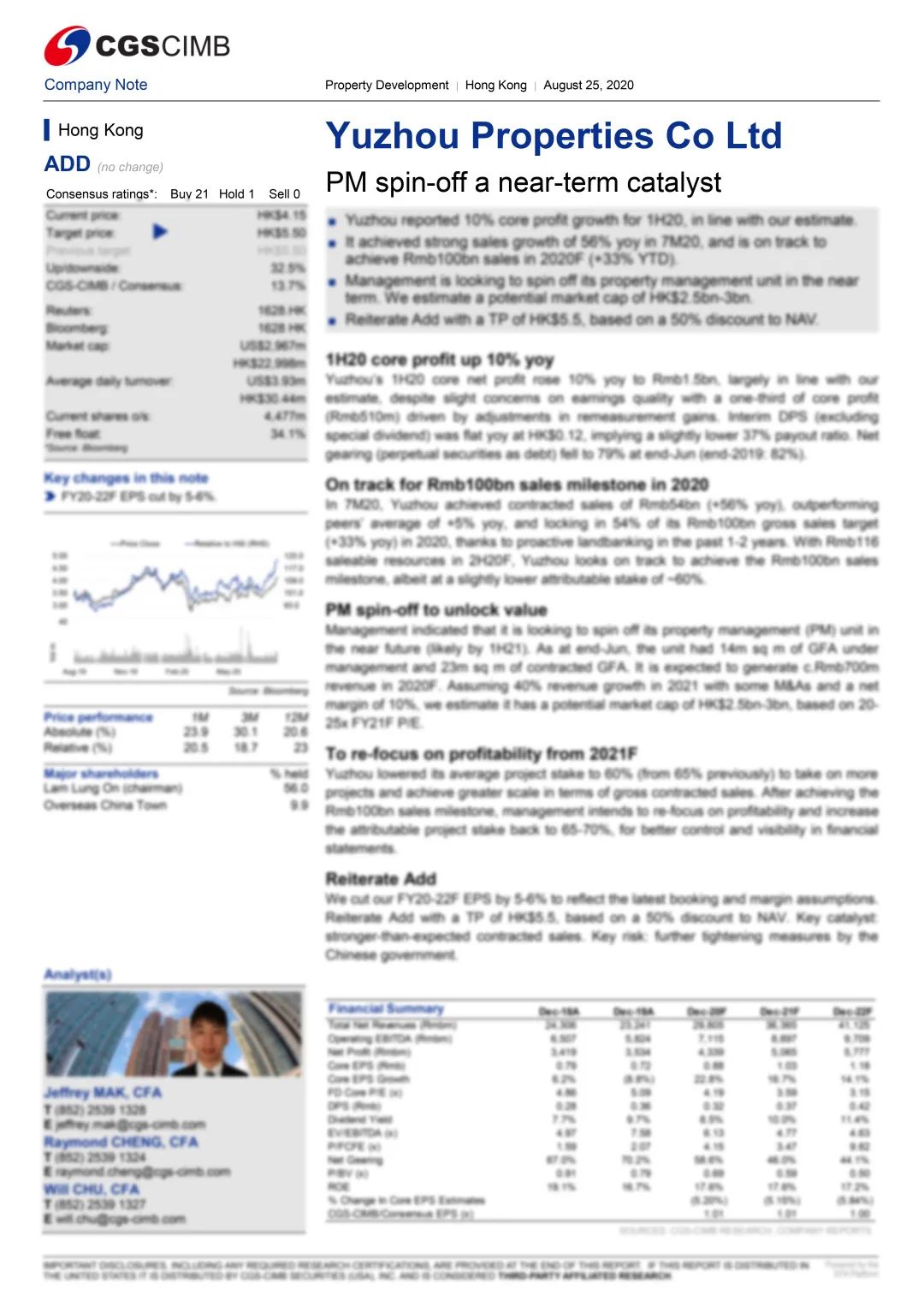 著名國際投行銀河-聯(lián)昌證券近日發(fā)表研究報告指出,禹洲集團(01628.HK)在2020年上半年合約銷售維持強勢增長勢頭,全年實現(xiàn)千億目標勢在必得,利潤水平同步上升加上物管業(yè)務即將分拆將釋放更多價值,銀河-聯(lián)昌重申禹洲集團“買入”評級,目標價5.5港元。
