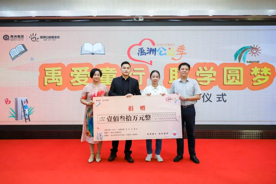 禹洲集團(tuán)副總裁、禹洲公益基金會常務(wù)理事張巖(左二)代表禹洲集團(tuán)向武漢經(jīng)開區(qū)教育局捐贈130萬元