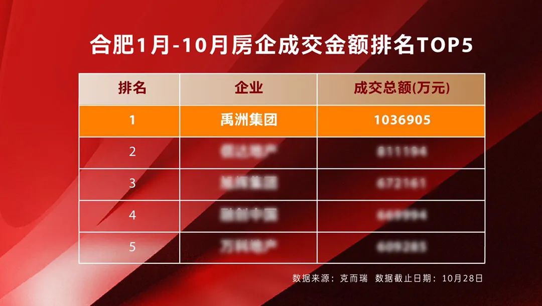第三方機(jī)構(gòu)克而瑞的數(shù)據(jù)顯示,截至10月28日,今年1-10月,禹洲集團(tuán)在合肥市場實現(xiàn)合約銷售103.69億元,為合肥市場首家合約銷售額突破百億的房企,并穩(wěn)居行業(yè)第一。