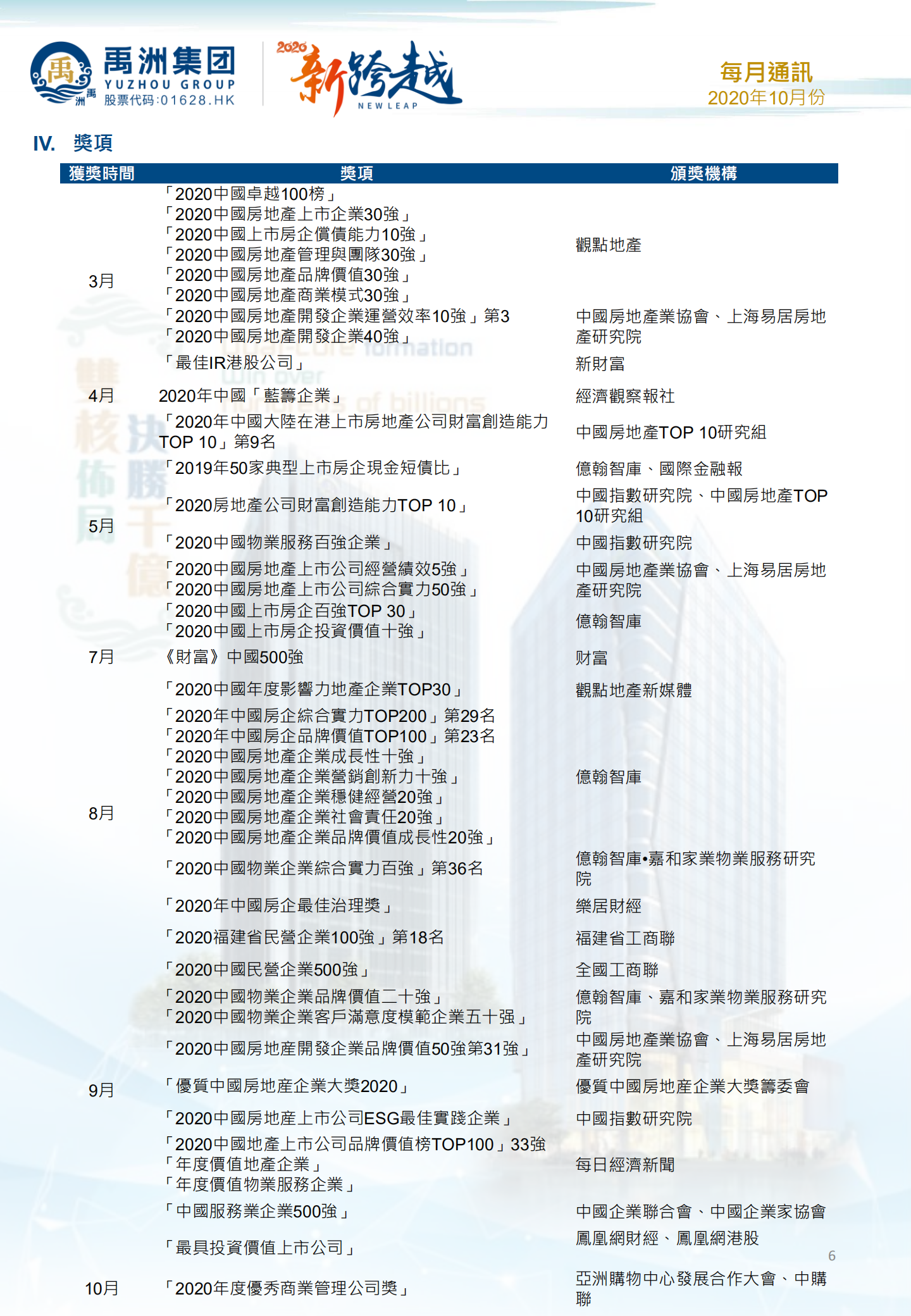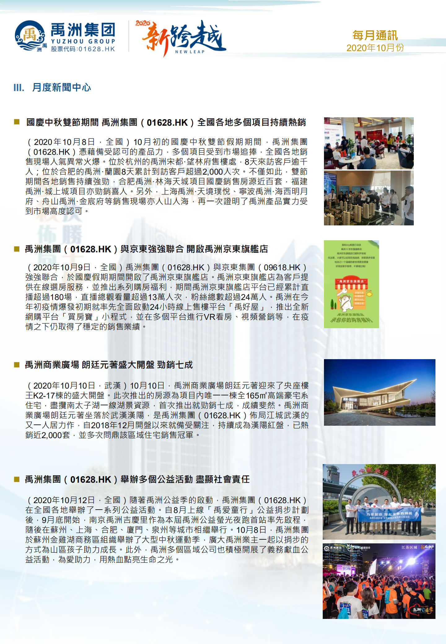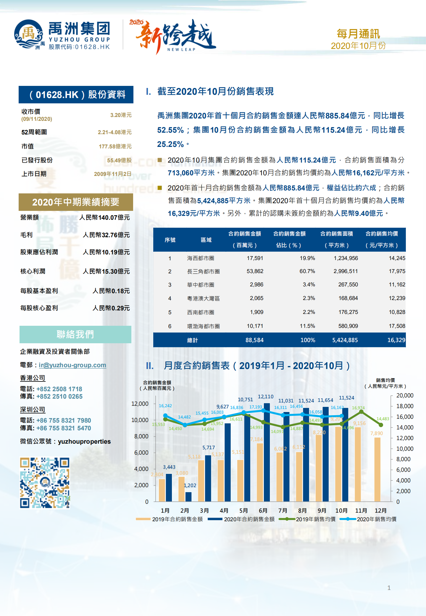 2020年10月,禹洲集團實現(xiàn)合約銷售金額為人民幣115.24億元,同比增長25.25%,合約銷售面積為713,060平方米,合約銷售均價約為人民幣16,162元/平方米。