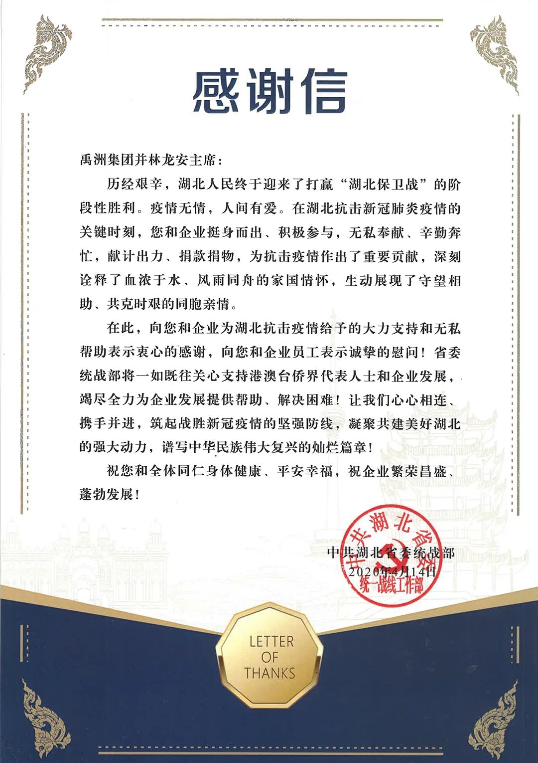 禹洲在抗疫中的表現(xiàn),也獲得了政府部門和行業(yè)機(jī)構(gòu)、媒體等的高度肯定。湖北省委統(tǒng)戰(zhàn)部、中央人民政府駐香港特別行政區(qū)聯(lián)絡(luò)辦公室、福建省海外聯(lián)誼會(huì)、廈門市僑務(wù)辦公室、天津市紅十字會(huì)、中國建設(shè)報(bào)社等單位就發(fā)來《感謝信》,對(duì)林龍安主席和禹洲集團(tuán)對(duì)抗擊疫情給予的大力支持和無私幫助給予高度肯定和贊賞。