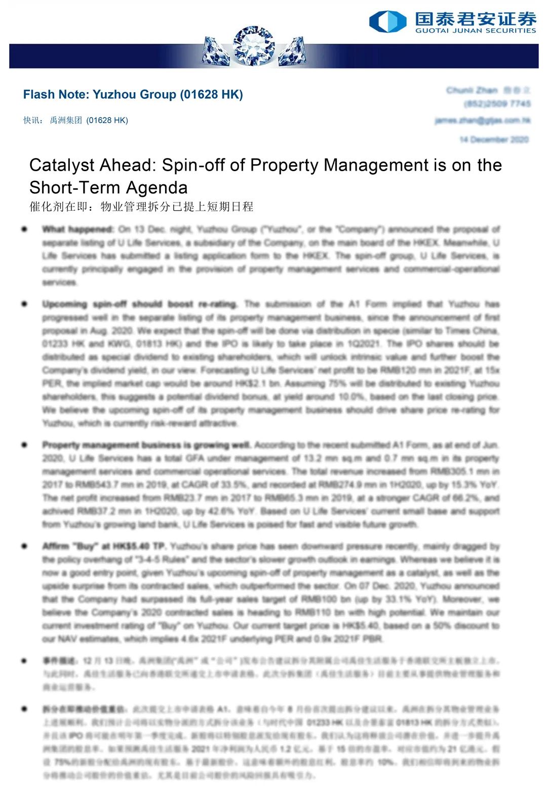 國(guó)泰君安國(guó)際指出,禹洲集團(tuán)此次提交上市申請(qǐng)表格A1,意味著自2020年8月份首次提出拆分建議以來(lái),禹洲在拆分其物業(yè)管理業(yè)務(wù)上進(jìn)展十分順利。國(guó)泰君安國(guó)際預(yù)計(jì)公司將以實(shí)物分派的方式拆分該業(yè)務(wù)(與時(shí)代中國(guó)01233.HK以及合景泰富01813.HK的拆分方式類似),并且該IPO將可能在明年第一季度完成。