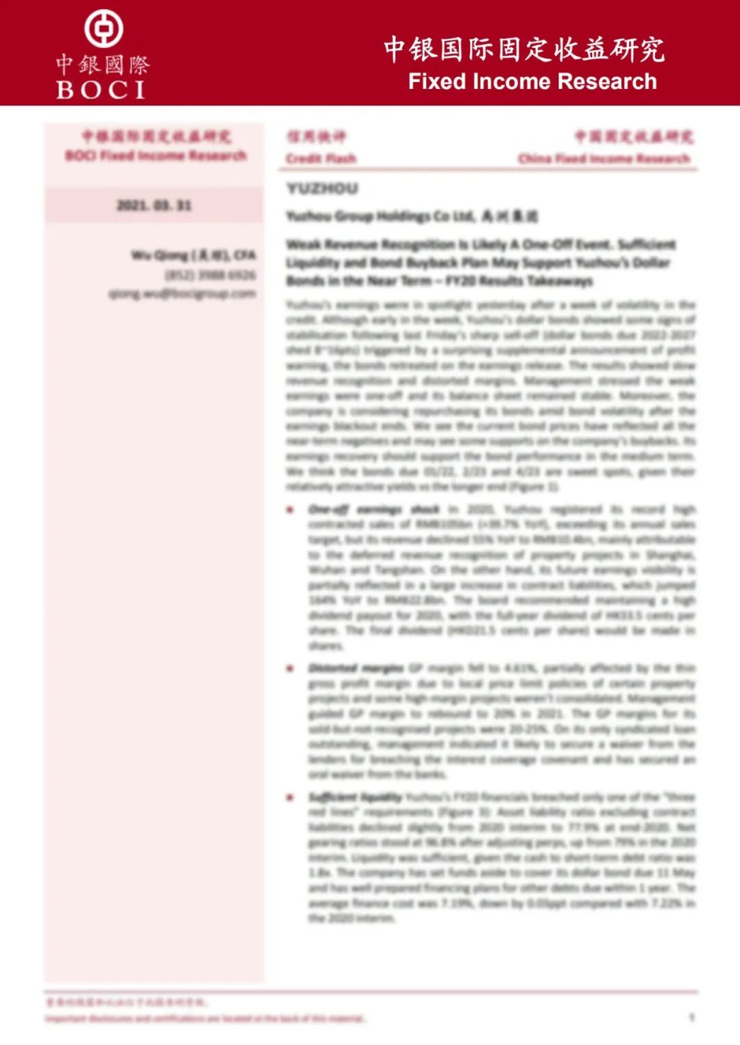 國(guó)際知名投行中銀國(guó)際近日發(fā)表固定收益類研究報(bào)告,禹洲集團(tuán)(01628.HK)美元債表現(xiàn)已經(jīng)逐漸表現(xiàn)出一定程度的企穩(wěn)跡象。報(bào)告指出,禹洲集團(tuán)2020年的盈利下降屬一次性的,主要原因在于部分項(xiàng)目延遲交付導(dǎo)致收入延遲確認(rèn),以及高利潤(rùn)項(xiàng)目未并表導(dǎo)致毛利率下降,而禹洲的資產(chǎn)負(fù)債表仍十分穩(wěn)健。中銀國(guó)際認(rèn)為,目前禹洲的債券價(jià)格已充分反映了近期所有的負(fù)面因素,并且公司近期的債券回購(gòu)展現(xiàn)了公司的充分信心,市場(chǎng)信心得以提振,預(yù)計(jì)集團(tuán)在中期盈利的恢復(fù)將繼續(xù)支持債券的表現(xiàn)。