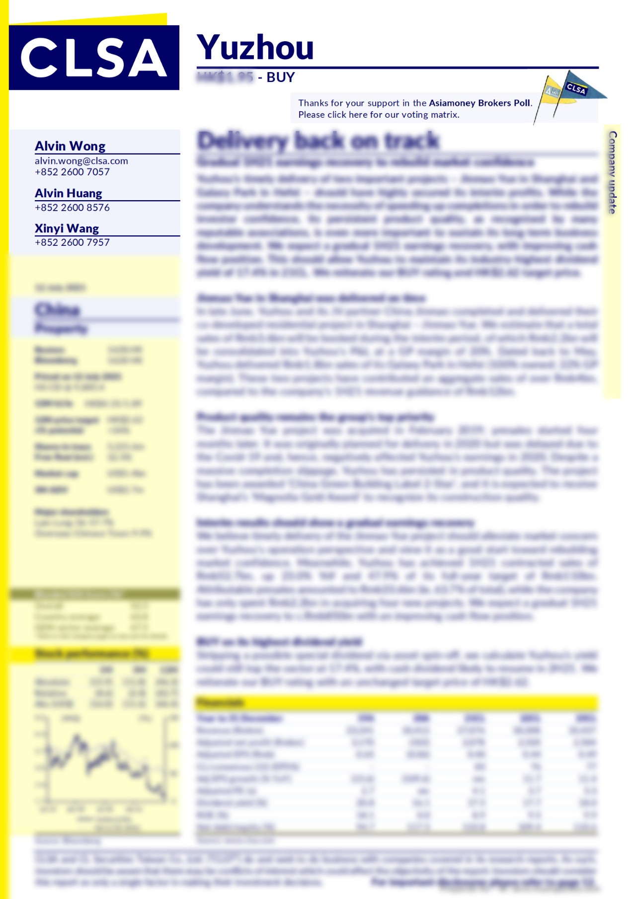 中信里昂認(rèn)為,金茂悅項(xiàng)目的順利交付可以視為重建市場(chǎng)信心的一個(gè)良好開端。同時(shí),禹洲2021年上半年實(shí)現(xiàn)了人民幣527億元的合約銷售額,同比增長(zhǎng)23.0%,已完成全年目標(biāo)人民幣1,100億元的47.9%。此外,集團(tuán)上半年僅花費(fèi)約人民幣22億元獲得了四個(gè)優(yōu)質(zhì)項(xiàng)目,在手現(xiàn)金充裕。中信里昂預(yù)計(jì),隨著現(xiàn)金流狀況的改善,公司2021年上半年的盈利有望恢復(fù)到正常水平。