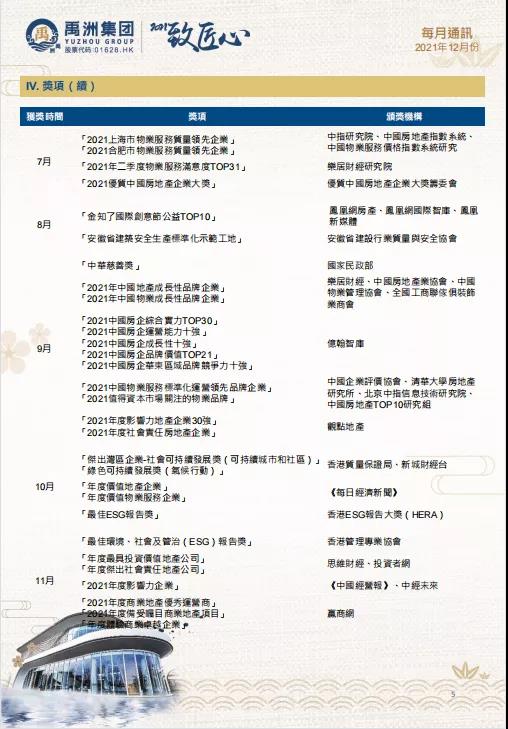 12月23日,禹洲集團在中國房地產(chǎn)報、中國住交會組委會、中國城市與區(qū)域治理委員會聯(lián)合主辦的“2021中國房地產(chǎn)年度盛典暨CIHAF中國住交會:長期主義——應勢與圖新”中,斬獲“2021中國房地產(chǎn)年度綜合實力品牌企業(yè)”,旗下禹洲物業(yè)獲得“2021中國物業(yè)服務年度綜合實力品牌企業(yè)”,多次獲得專業(yè)評選認可不僅彰顯了禹洲集團本身硬實力,更加反映出資本市場及專業(yè)機構(gòu)認可,突顯了禹洲未來平衡穩(wěn)健且持續(xù)發(fā)展的巨大潛力空間。