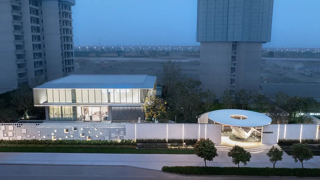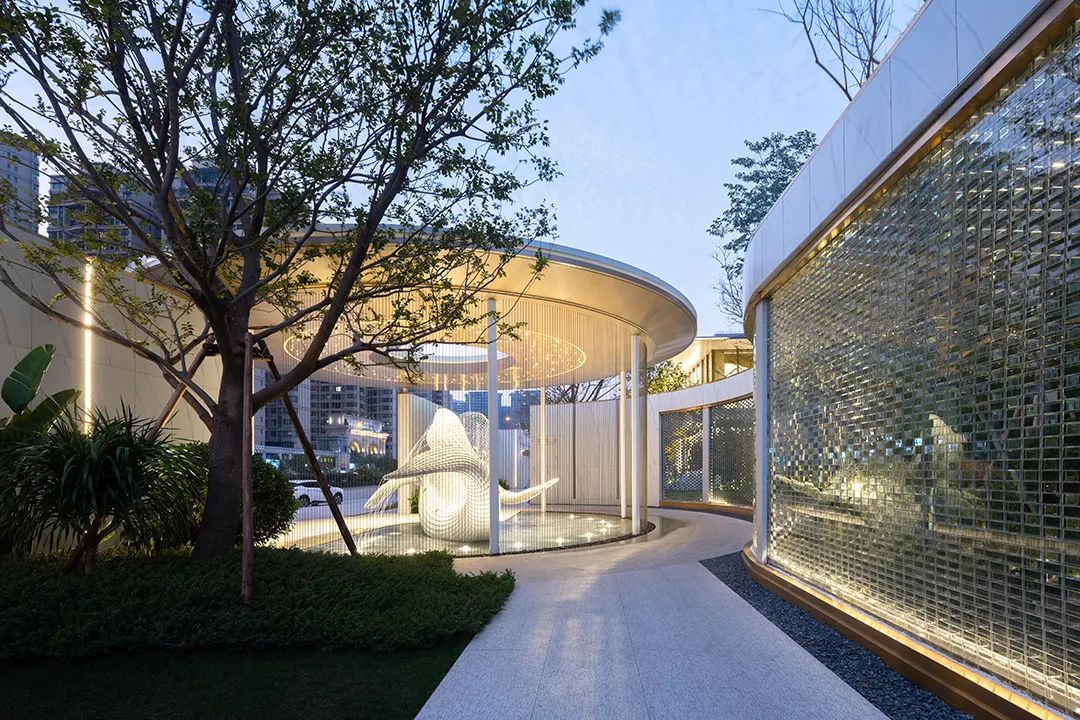 弧形臺(tái)階與門(mén)樓圓頂以繪畫(huà)般的弧度平行,登門(mén)而上,給予每個(gè)業(yè)主及來(lái)訪者如步入殿堂般的儀式感;而入門(mén)處水面的波光與門(mén)樓的燈光星星點(diǎn)點(diǎn)地交相輝映著,更有天光流瀉而下,聚氣于此,為人們創(chuàng)造出一片遠(yuǎn)離塵世的藝術(shù)場(chǎng)域。