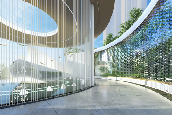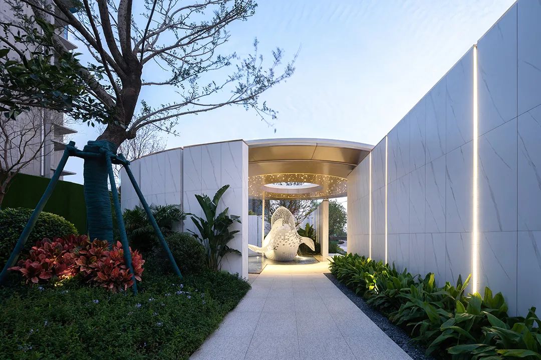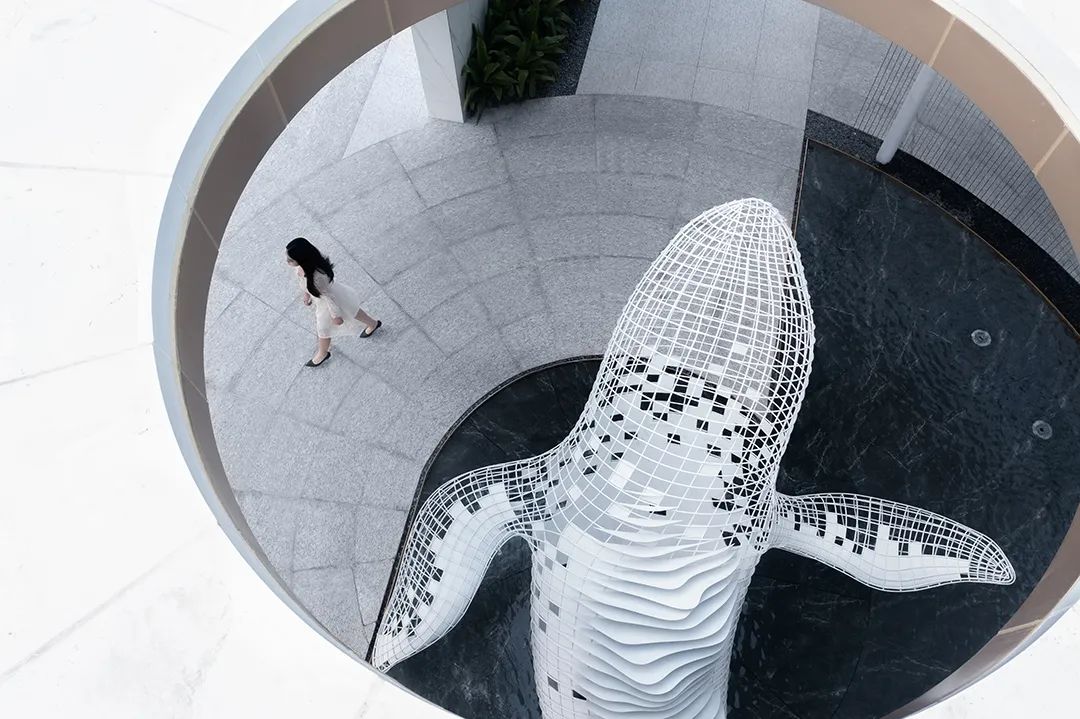 入口處主景雕塑以小禹兒的原型——白鯨為主題。白鯨立于水面之上,以流暢的線條托起五洲四海,寓意其將承接生活與理想,載夢(mèng)起航,扶搖而上。