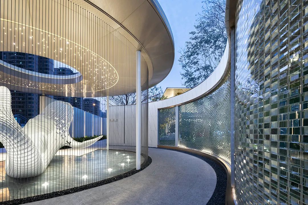 設(shè)計(jì)師將8000塊玻璃磚搭建成弧形景墻,讓每一塊每一面都折射出輕盈而純凈的畫(huà)面;而在這光與影的交織中,光線肆意穿梭,那朦朧的烏桕林都搖曳著細(xì)細(xì)漏出幾處斑駁。