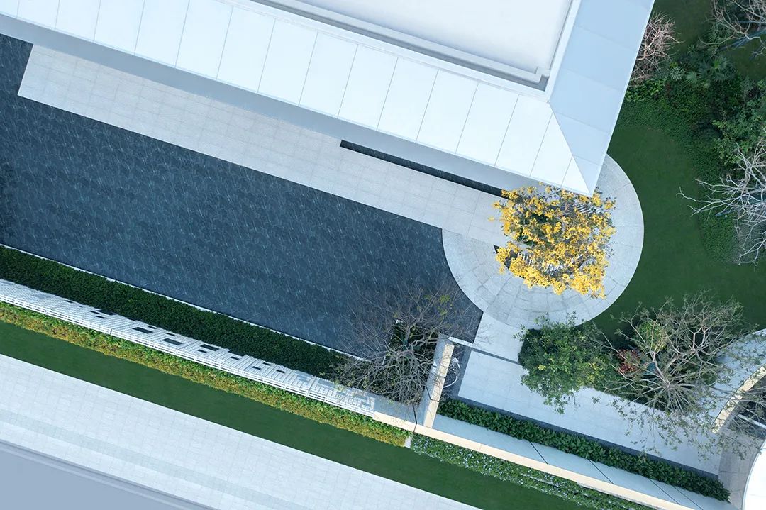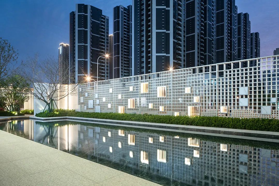 鏡面水景映襯著建筑與景墻,彼岸則仿佛漂浮于水面之上;每當(dāng)夜幕降臨,月懸浮于境面之上,仿佛伸手觸碰就能攬入懷中。而遠(yuǎn)處層疊錯(cuò)落的特色種植池像島又像山,影影綽綽地籠罩著一層輕紗,幽秘而靈動(dòng)。