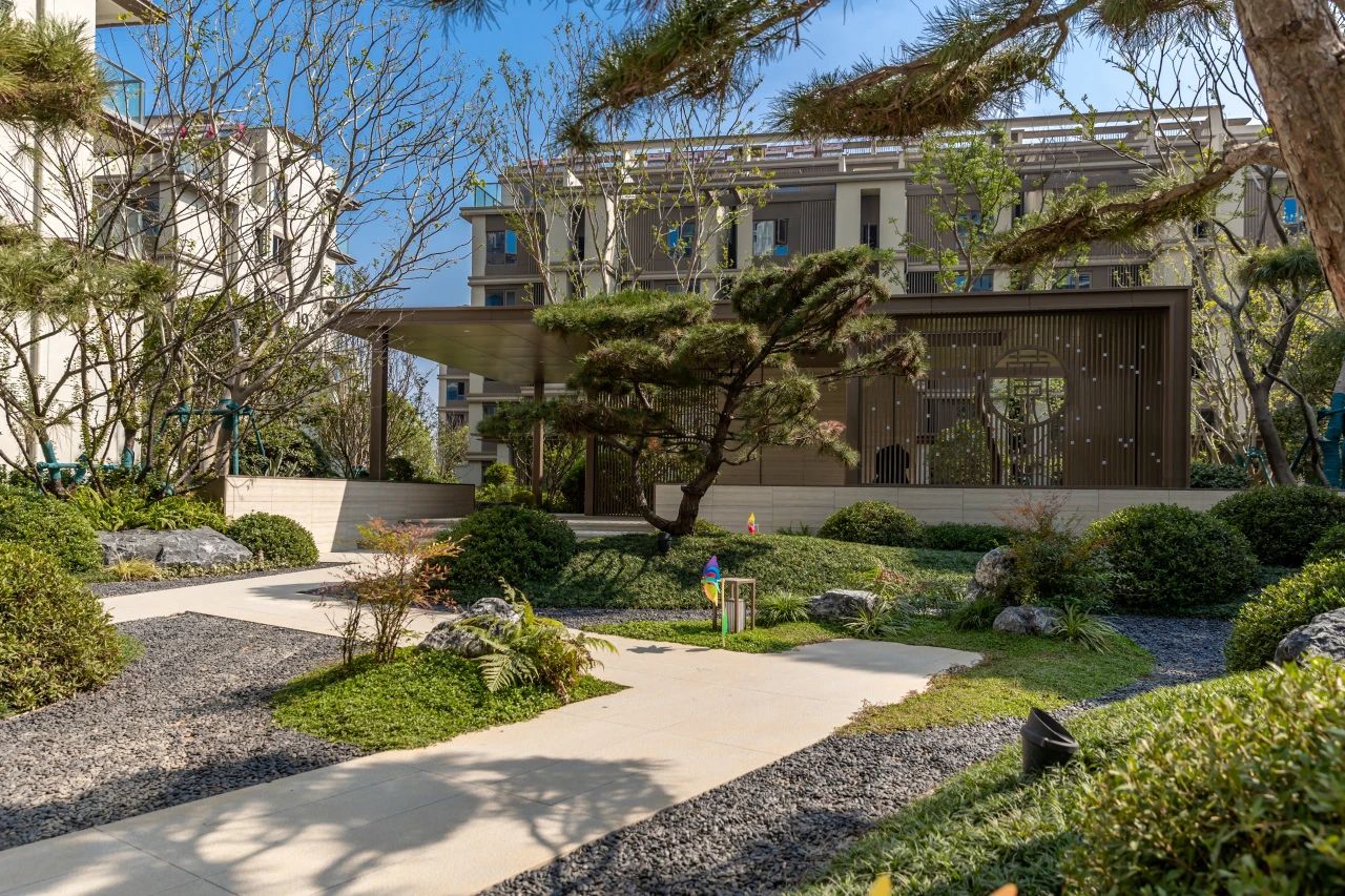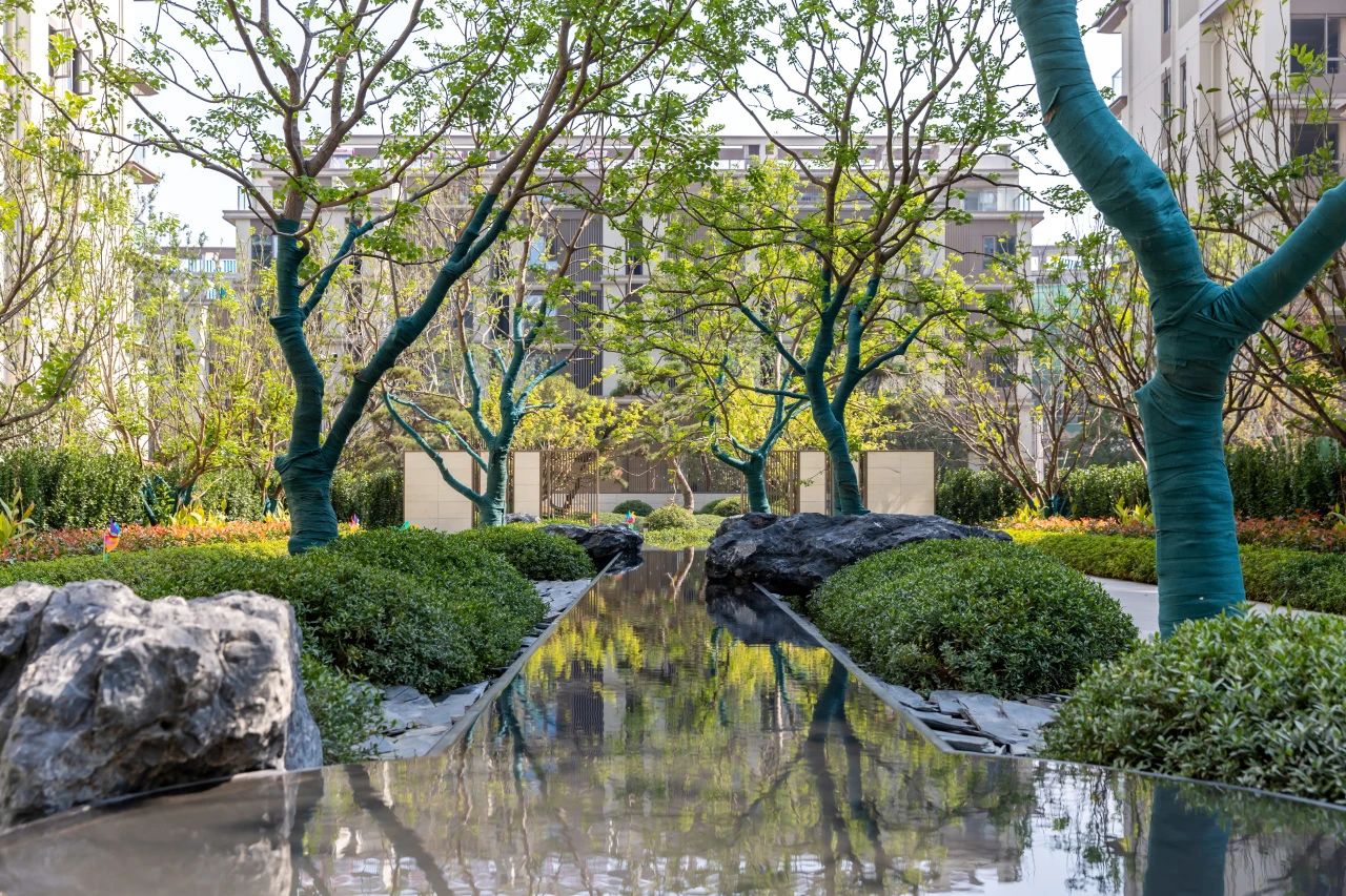 中庭區(qū)域的歸家綠道,呈現(xiàn)出了隱林入畫的靜逸空間,再以曲水流觴的形式串聯(lián)景觀空間,打造出清幽寧和的質(zhì)感生活。
